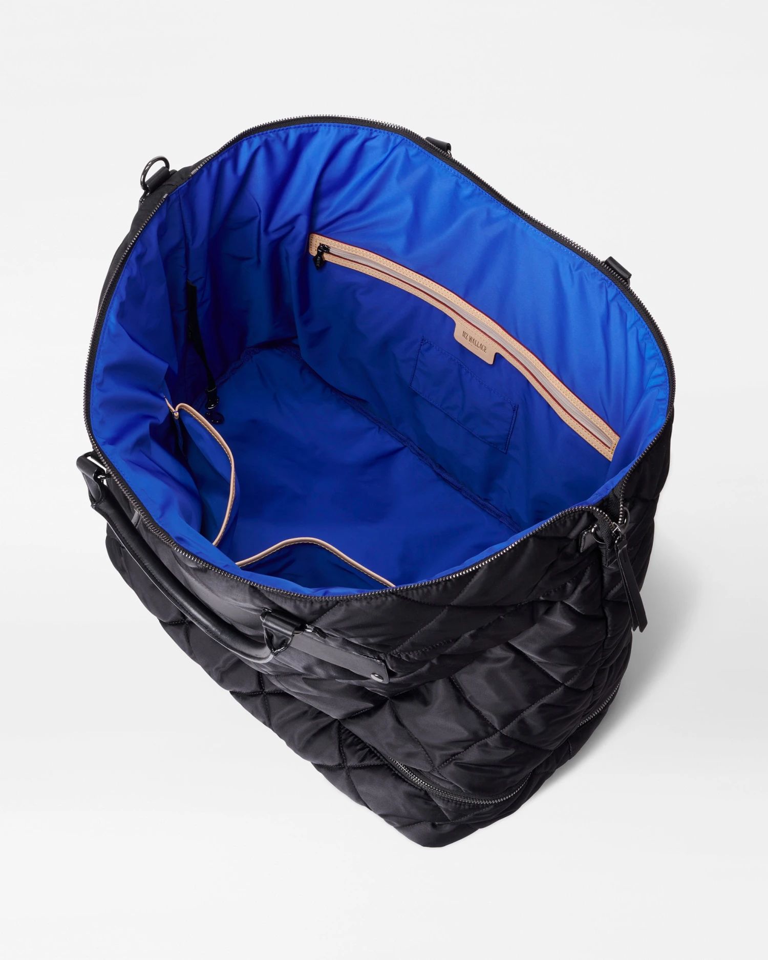 Ready for any journey, with room for possibilities. With two exterior pockets, a zip top closure, rolled leather handles, a detachable nylon crossbody strap and a luggage sleeve