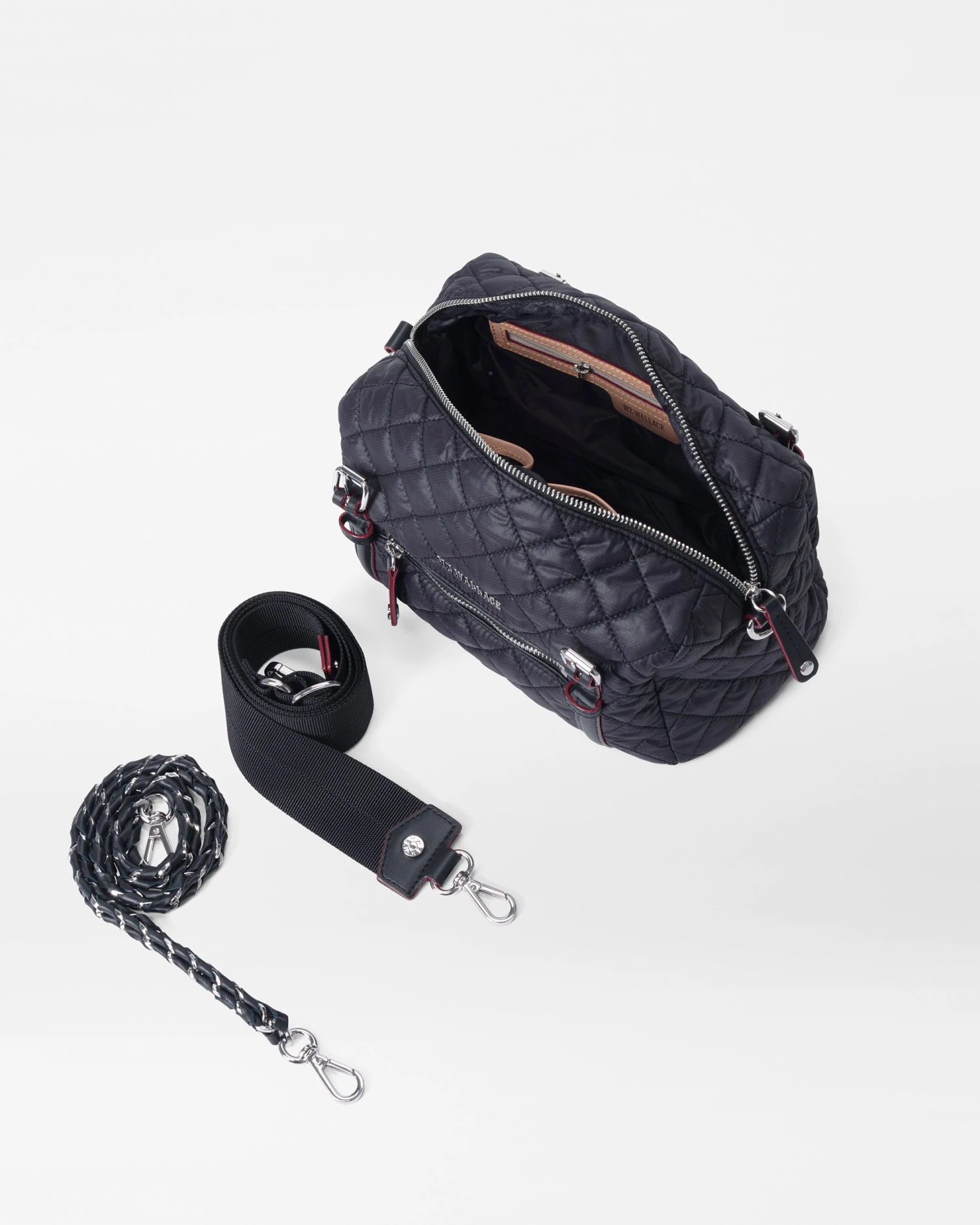Like a barrel—but better, with two adjustable leather handles, seven pockets, a zip top closure, a detachable chain and leather strap, a detachable leather wrapped chain strap, a detachable, adjustable nylon crossbody strap and a 100% recycled nylon fabrication.