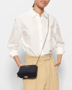 A sized-down version of the Box Tote silhouette, this sleek, structured mini tote has a zippered central compartment with three interior pockets, two exterior zip pockets, and two exterior slip pockets for easy access to your essentials, a detachable, adjustable crossbody strap and a 100% recycled nylon fabrication.